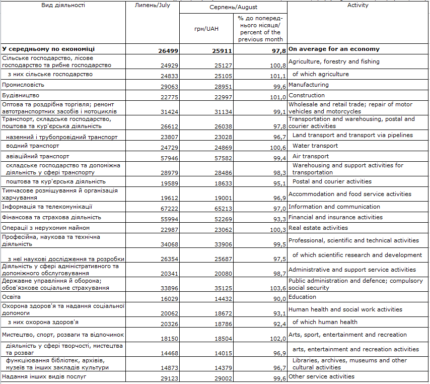 За видами економічної діяльності найвищі заробітні плати у сфері інформації та телекомунікацій (65 213 грн), на авіаційному транспорті (57 582 грн) та у сфері фінансів і страхової діяльності (52 269 грн).