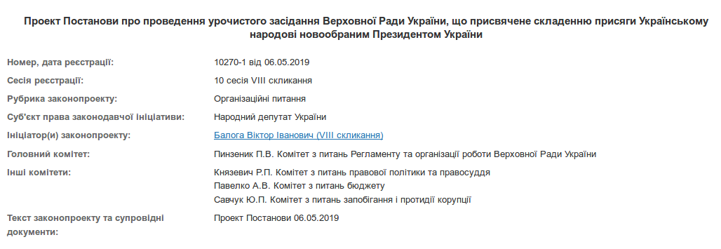 Позафракційний народний депутат Віктор Балога зареєстрував у Верховній Раді проект постанови №10270-1 "Про проведення урочистого засідання Верховної Ради України, що присвячене складенню присяги Українському народові новообраним Президентом України".