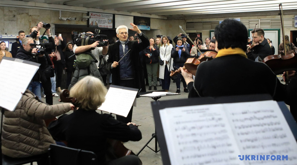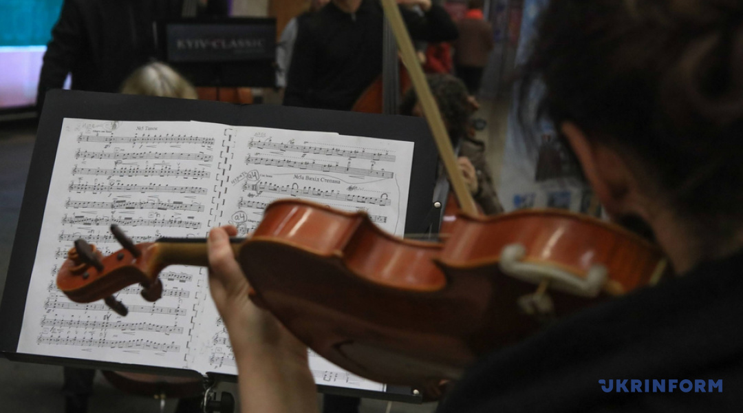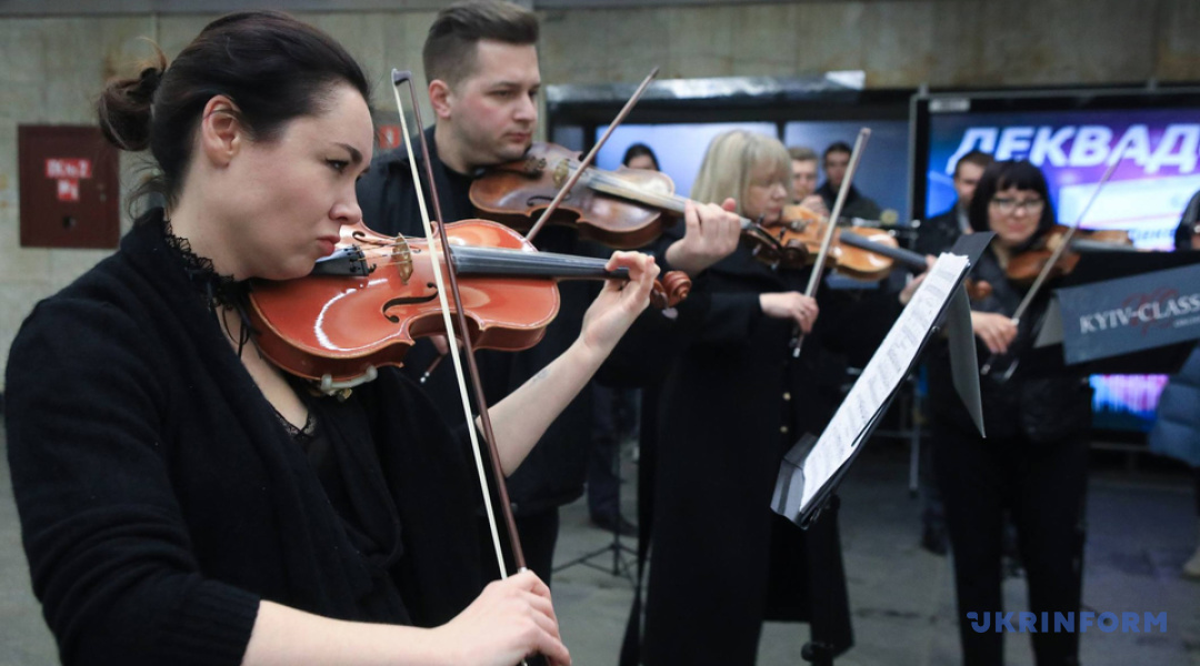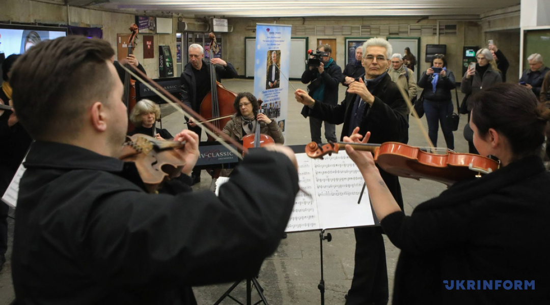 Як повідомляє кореспондент Укрінформу, акцію провів камерний оркестр «Київ Класик» у вестибюлі станції метро «Майдан Незалежності».