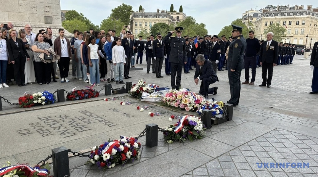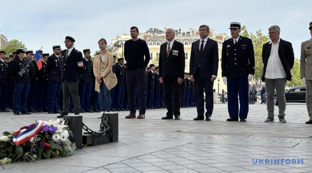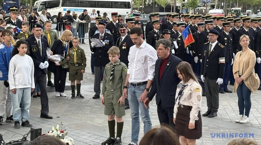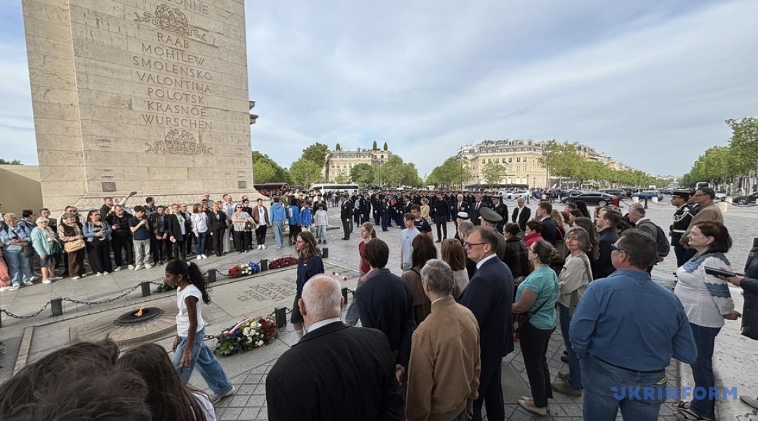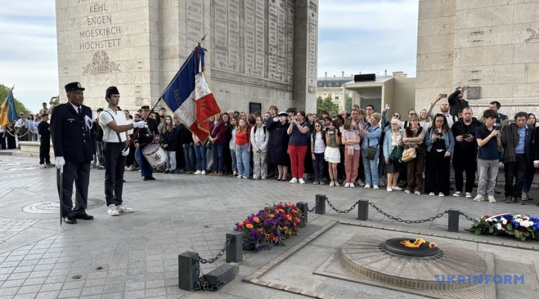 Як передає кореспондент Укрінформу, українська громада, французькі ветерани та молодь пройшли ходою Єлисейськими полями до монумента Невідомому солдату, поклали квіти та символічно запалили вічний вогонь.