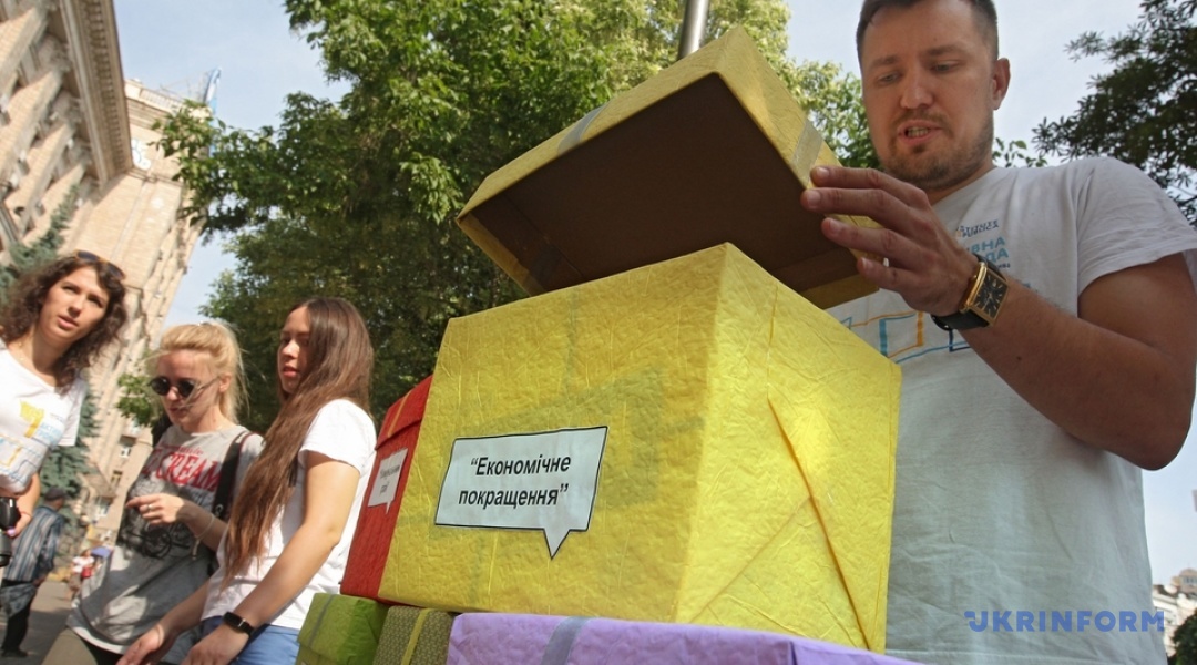 Так, організатори на Майдані Незалежності в Києві пропонують перехожим обрати собі "подарунок" - коробку в яскравій обгортці із популярними політичними лозунгами - "Економічне покращення", "Комунальний рай", "Добробут в кожній країні" та "Без корупції".