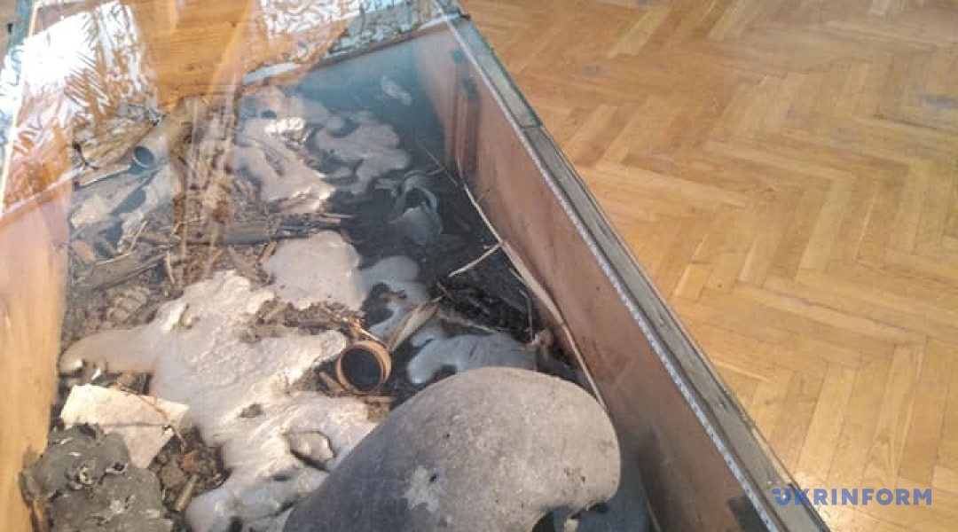Іншим центральним експонатом виставки є рештки землі з плавленим алюмінієм, знайдені біля Іловайська. “Настільки були гарячі бої, що сама техніка не витримувала їх, плавилась. Це знято волонтерами 3 вересня 14 року, які займались ідентифікацією бійців”, - розповіла Понипаляк.