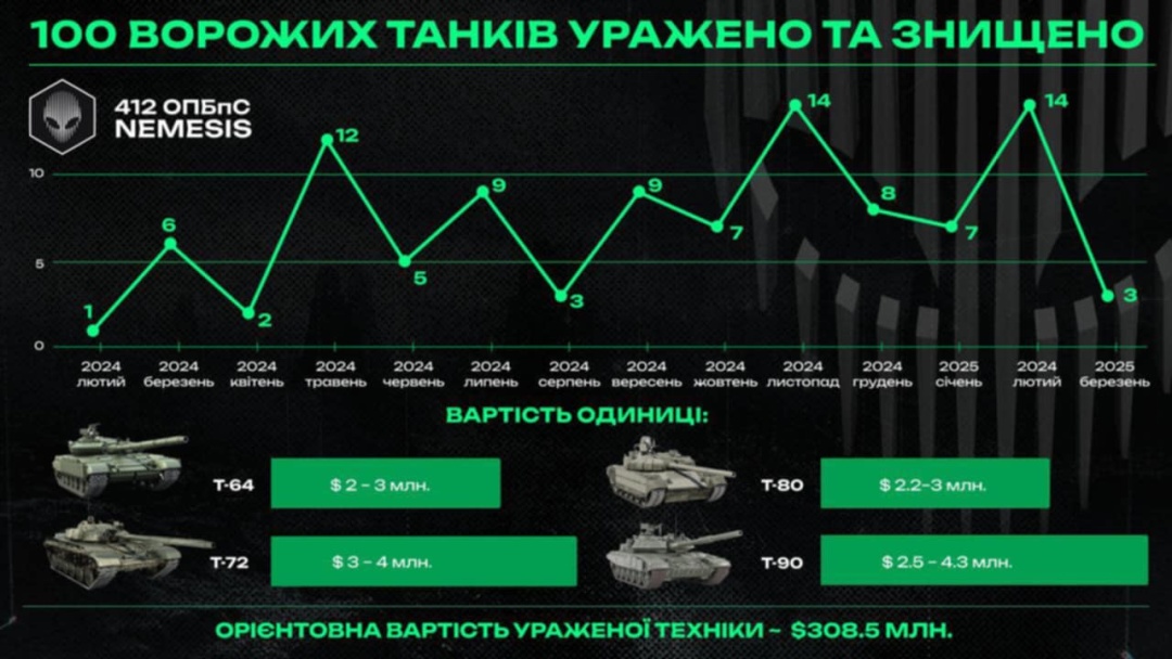 Вартість одного російського танка, залежно від модифікації, становить від 2 до 4,3 мільйона доларів. Тоді як вартість українського дрона, за допомогою якого Nemesis знищує ціль, близько 25 тисяч доларів.