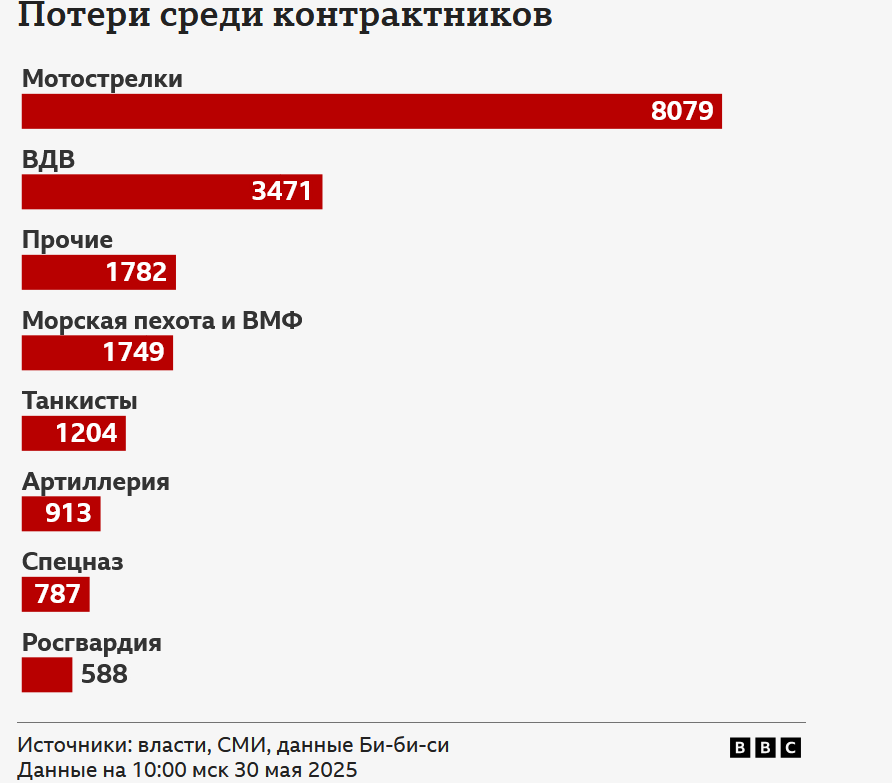 У зведенні йдеться, що із загиблих контрактників російської армії 8 079 людей були мотострілками, 3 471 особа – десантниками, ще 1 749 військових належали до морської піхоти і військово-морського флоту РФ, а 1 204 людини були танкістами. Серед артилеристів, спецпризначенців і росгвардійців з початку повномасштабного вторгнення загинули 913, 787 та 588 осіб відповідно. Підрозділи, до яких належали ще 1 782 загиблих, не повідомляються.