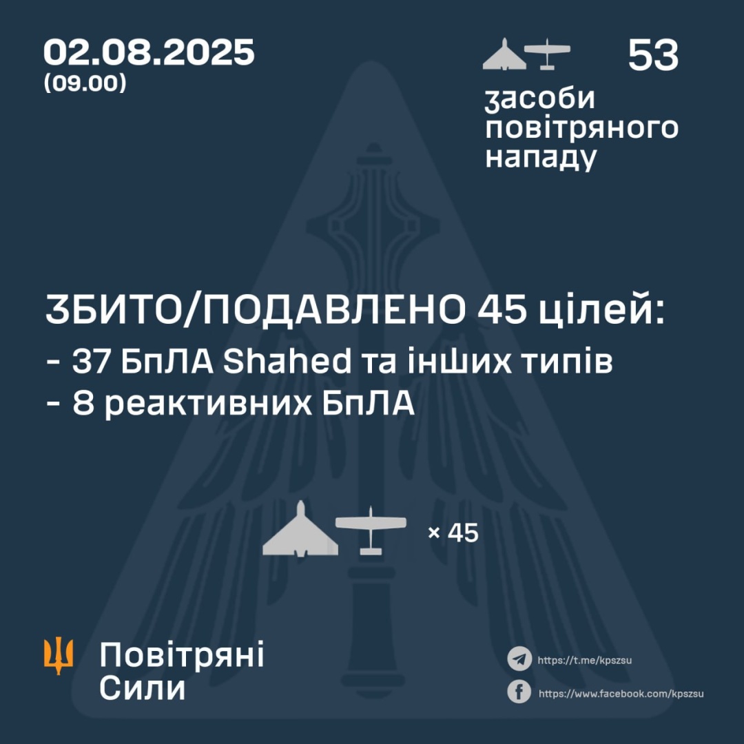 Із 18:00 п'ятниці, 1 серпня, ворог атакував 53 засобами повітряного нападу: 45 ударними БПЛА типу Shahed і безпілотниками-імітаторами різних типів із напрямків: Міллерово, Курськ, Брянськ (РФ), Гвардійське (тимчасово окупований Крим), а також вісьмома швидкісними (реактивними) БПЛА із Брянської області.