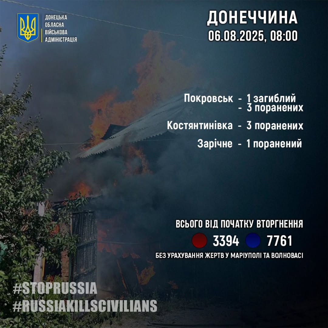 У поліції уточнили, за 5 серпня війська РФ завдали 3 111 ударів по лінії фронту та житловому сектору. Влучання відбулись у 6 населених пунктах: містах Костянтинівка, Покровськ, селищі Зарічному, селах Іванопілля, Кам’янка, Степанівка.