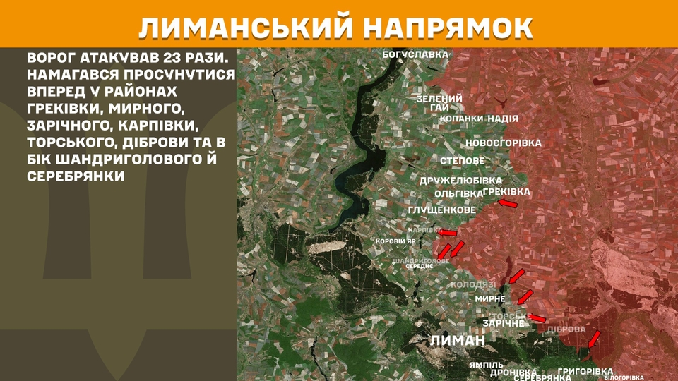 На Лиманському напрямку ворог атакував 23 рази. Намагався просунутися вперед у районах Греківки, Мирного, Зарічного, Карпівки, Торського, Діброви та в бік Шандриголового й Серебрянки.