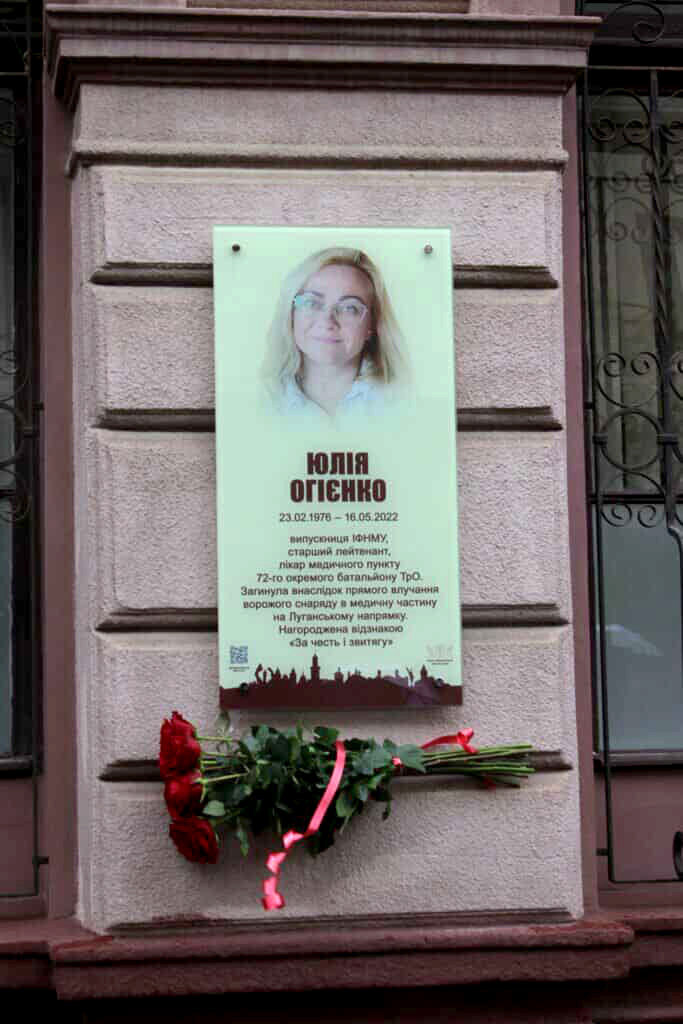 Нещодавно на фасаді цього вишу встановили анотаційні дошки у пам’ять про загиблих медиків. На одній із них – портрет усміхненої Юлії.