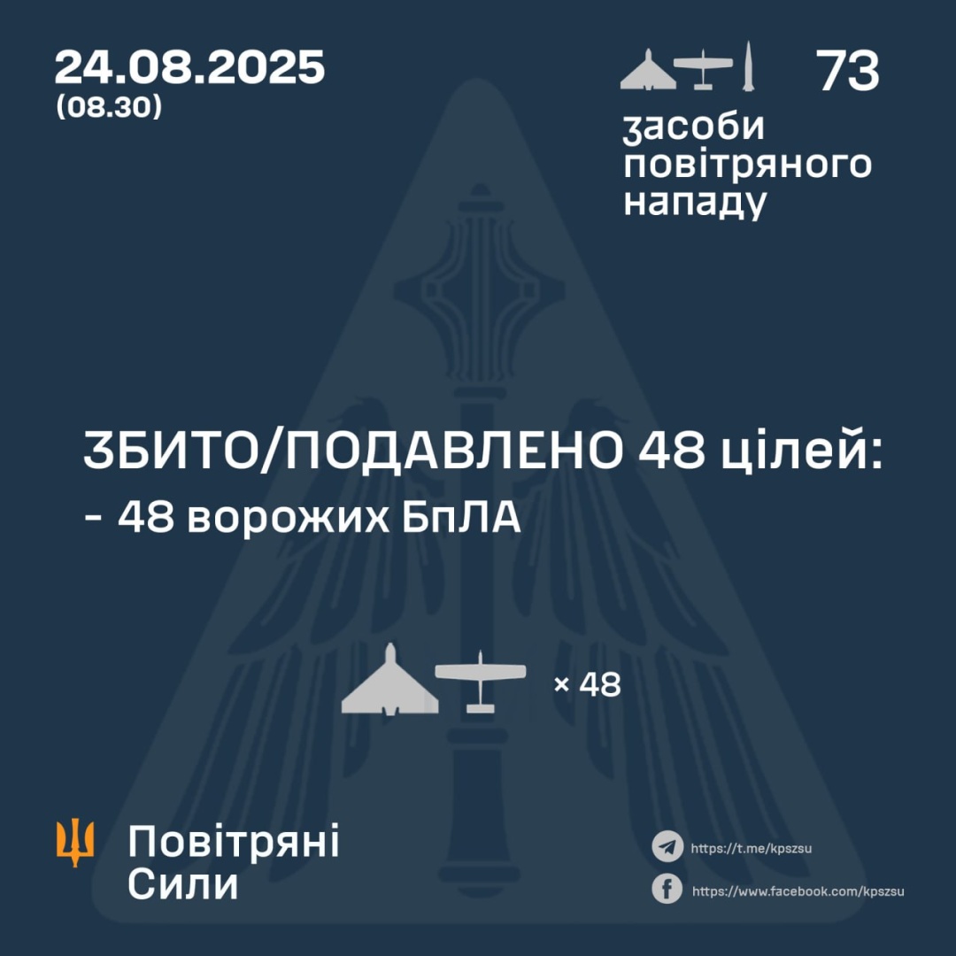 Попередньо визначено, що станом на 08:30 неділі, 24 серпня, протиповітряна оборона збила/заглушила 48 російських безпілотників типу Shahed і дронів-імітаторів різних типів на півночі, сході та півдні країни.
