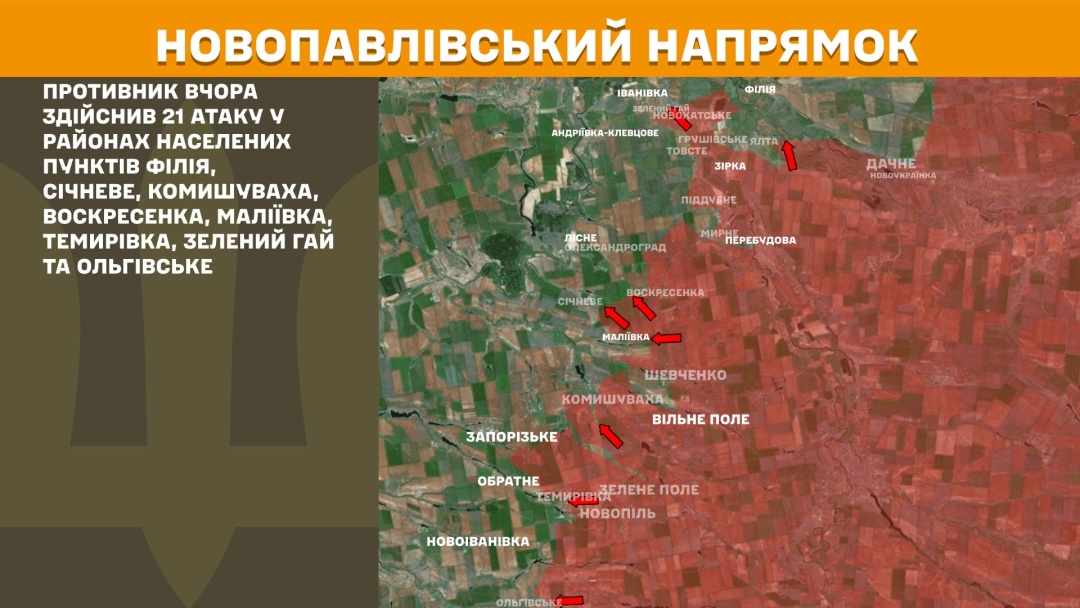 На Новопавлівському напрямку ворог здійснив 21 атаку у районах Філії, Січневого, Комишувахи, Воскресенки, Маліївки, Темирівки, Зеленого Гаю та Ольгівського.