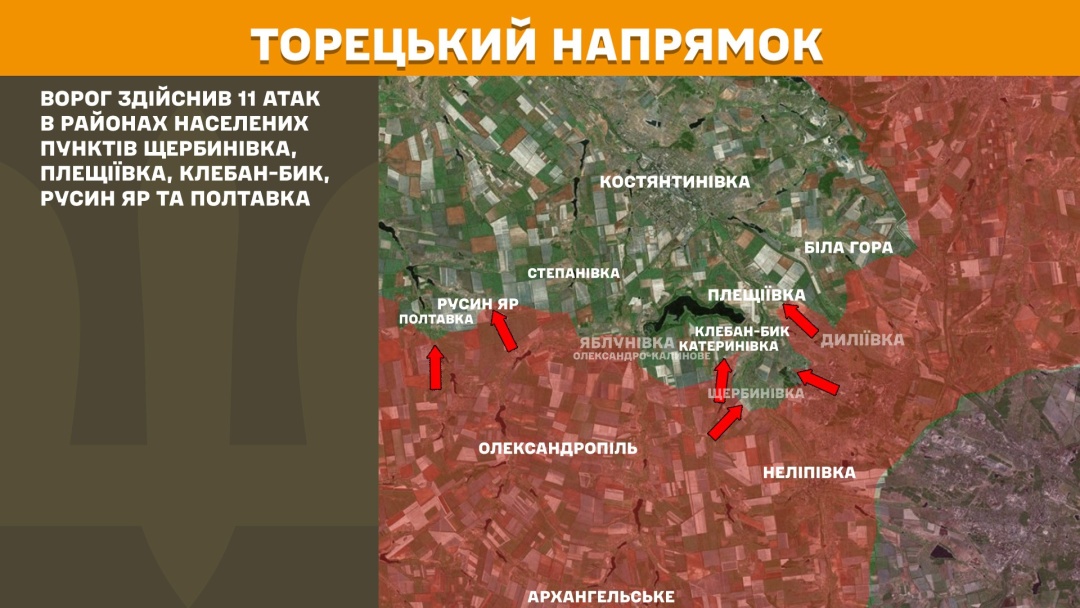 На Торецькому напрямку ворог здійснив 11 атак у районах Щербинівки, Плещіївки, Клебан-Бика, Русиного Яру і Полтавки.