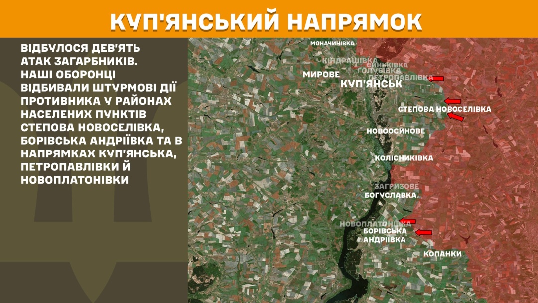 На Куп’янському напрямку сталося дев’ять російських атак. Сили оборони відбивали штурмові дії ворога у районах Степової Новоселівки, Борівської Андріївки, у напрямках Куп’янська, Петропавлівки і Новоплатонівки.