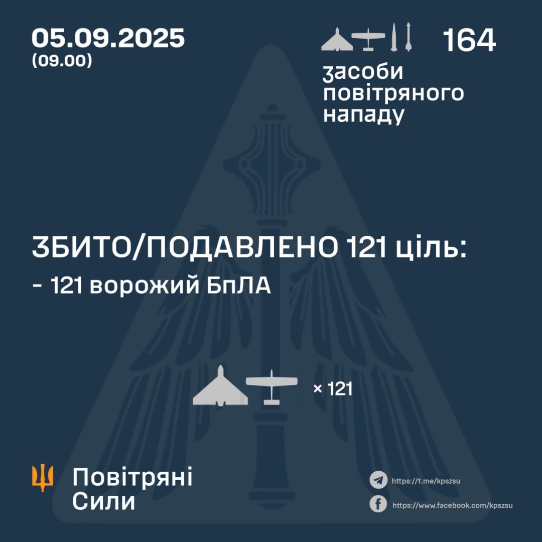 За попередніми даними, станом на 09:00 п'ятниці, 5 вересня, протиповітряна оборона збила/подавила 121 БПЛА типу Shahed і дрони-імітатори різних типів на півночі та сході країни.