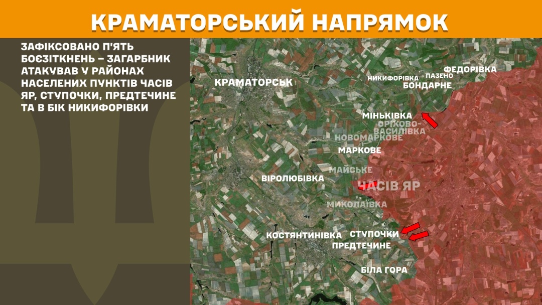 На Краматорському напрямку зафіксовано п’ять боєзіткнень. Загарбники атакували у районах Часового Яру, Ступочок, Предтечиного та в бік Никифорівки.