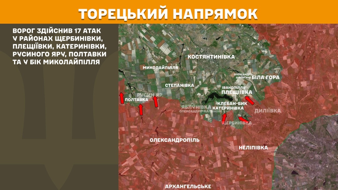 На Торецькому напрямку ворог здійснив 17 атак у районах Щербинівки, Плещіївки, Катеринівки, Русиного Яру, Полтавки та у бік Миколайпілля.