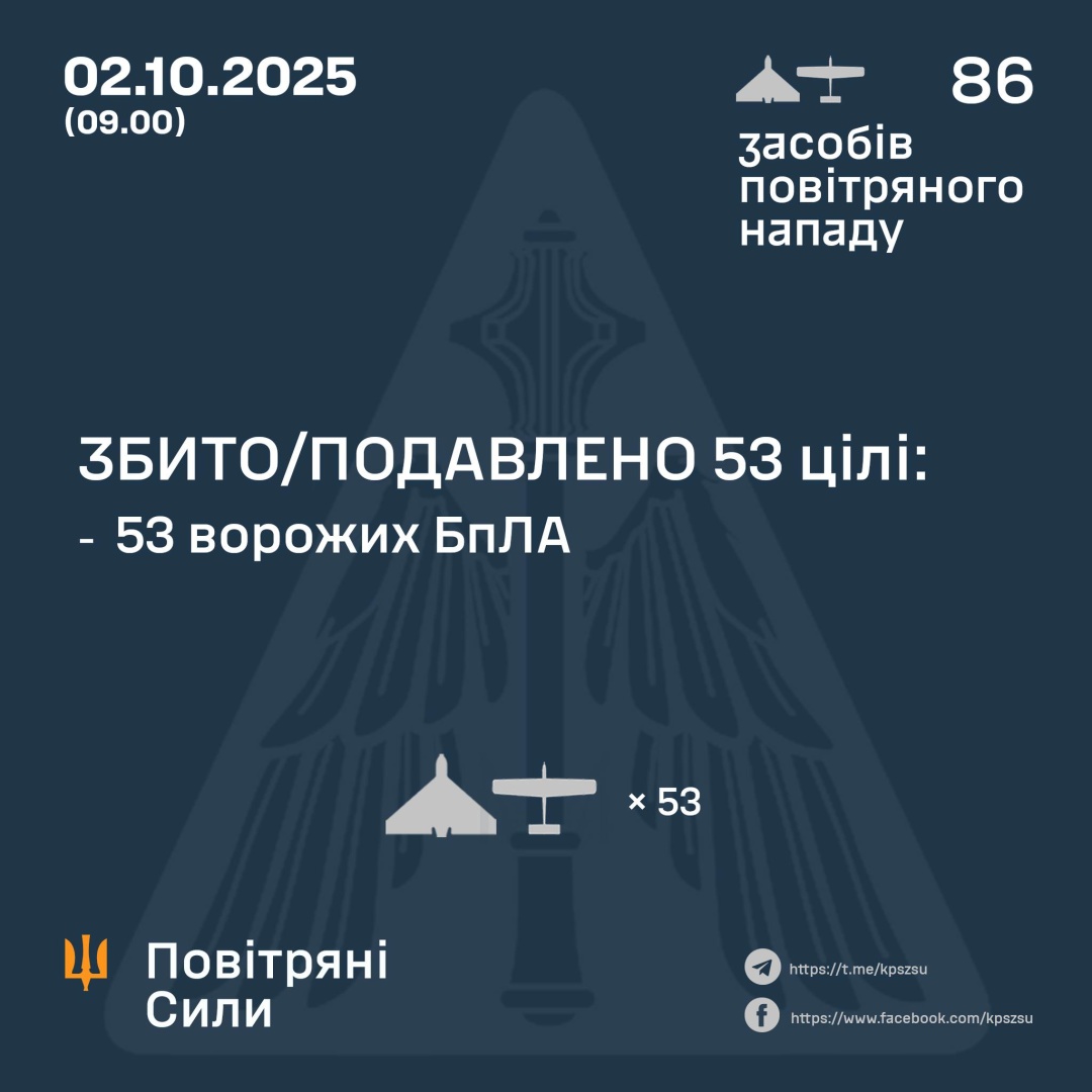 Вночі 2 жовтня ворог атакував 86 ударними БПЛА типу Shahed, "Гербера" і безпілотниками інших типів із напрямків: Брянськ, Орел, Приморсько-Ахтарськ, Міллерово.