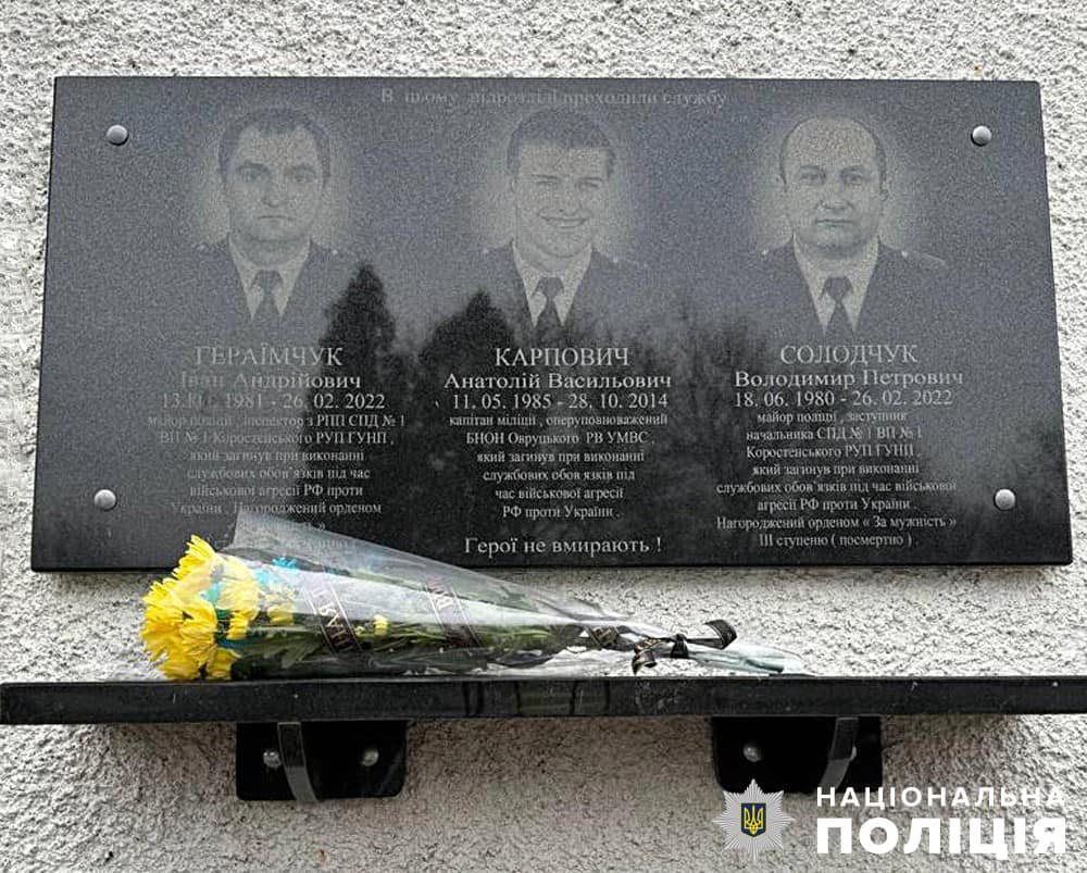 3 жовтня 2022 року на будівлі Овруцького відділу Коростенського РУП ГУНП у пам'ять про загиблих правоохоронців відкрили меморіальну дошку.