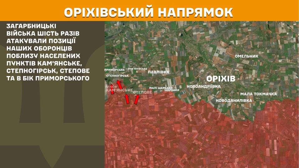 На Оріхівському напрямку загарбницькі війська шість разів атакували позиції українських оборонців поблизу населених пунктів Кам’янське, Степногірськ, Степове та в бік Приморського.