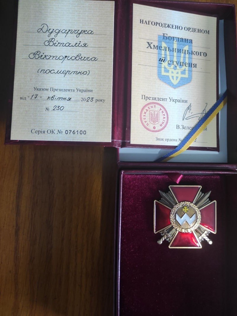 Пам’ять про Віталія вшанували і на державному рівні. Президент України Володимир Зеленський підписав Указ про нагородження лейтенанта Віталія Дударчука орденом Богдана Хмельницького III ступеня (посмертно).
