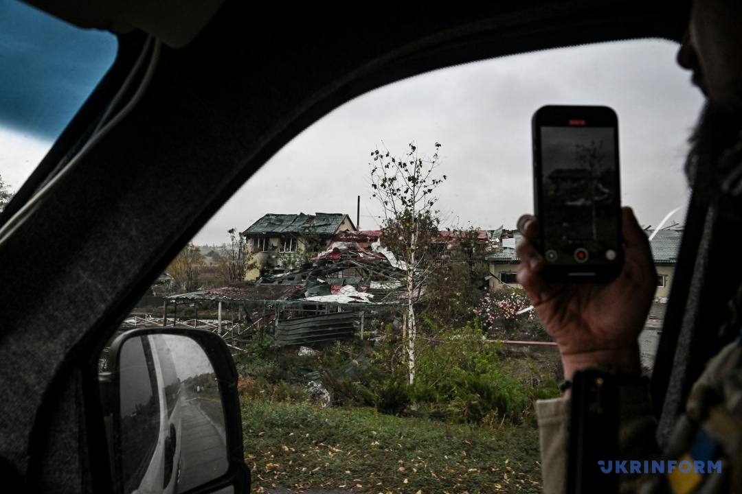 Встигаю через вікно автівки розгледіти двір, куди влучив ворожий снаряд. Видно, що була пожежа, від хати лишилися руїни.