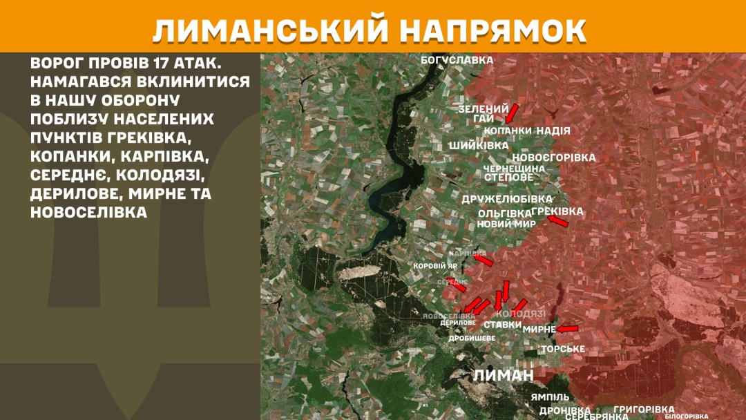 На Лиманському напрямку ворог провів 17 атак. Намагався вклинитися в нашу оборону поблизу населених пунктів Греківка, Копанки, Карпівка, Середнє, Колодязі, Дерилове, Мирне та Новоселівка.