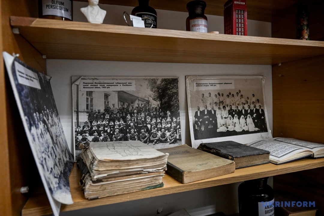 На дверях одного з кабінетів є сліди від вибухової хвилі, тут і працює Юрій Юрійович. На стінах – прапори та різні подяки. У старенькій шафі стоять старезні чорно-білі фотографії колективів лікарні, рукописний молитовник, медичний довідник 1927 року, написаний українською мовою. За словами Скребця, – шикарна книжка, в якій є все, що треба знати земському лікареві. Час від часу він відволікається – йому постійно хтось телефонує, треба повертатися до роботи.