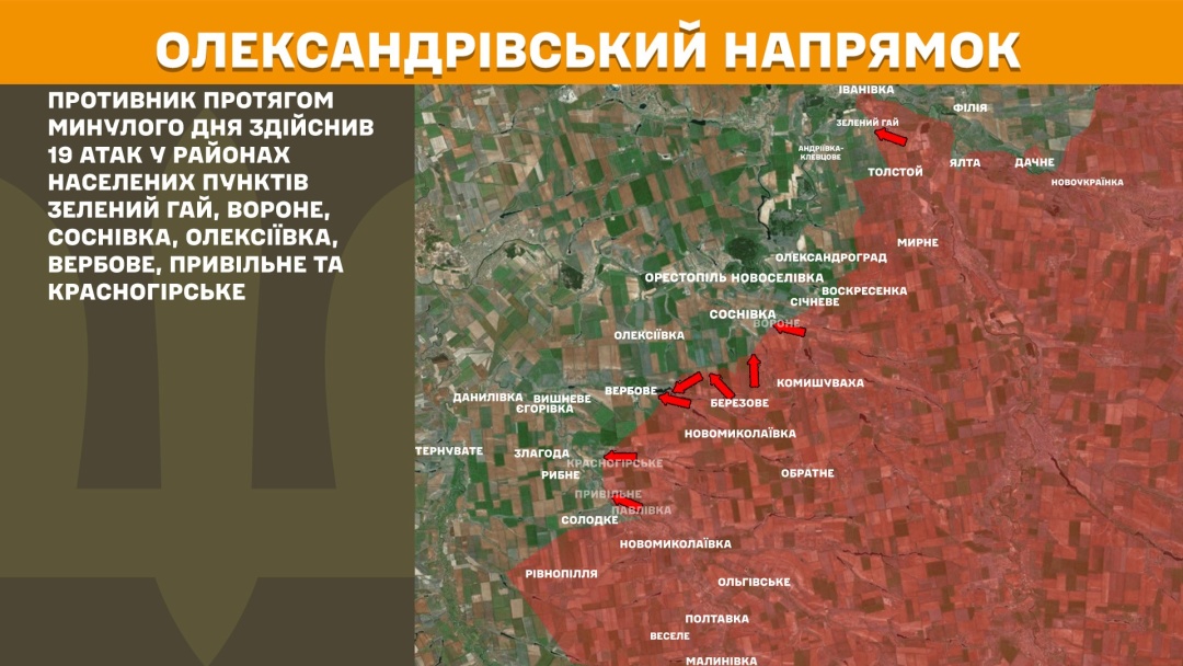 На Олександрівському напрямку противник протягом минулого дня здійснив 19 атак у районах населених пунктів Зелений Гай, Вороне, Соснівка, Олексіївка, Вербове, Привільне та Красногірське.