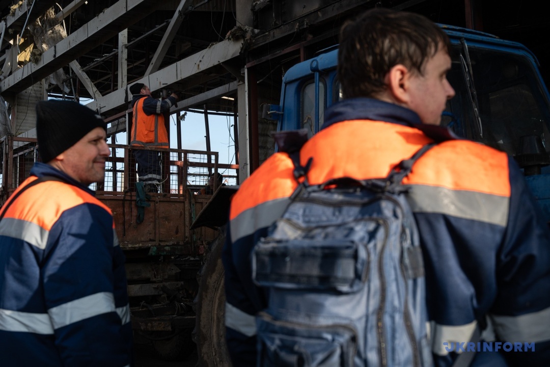 На території депо перше, що відчувається, – запах гару. Він досі зберігається в повітрі після нічного удару 6 грудня. Перед очима постають значні руйнування, зокрема, три знищені вагони, вкриті сажею. Далі переходимо через заготівельний цех і бачимо, що розбір завалів триває. Працюють крани, фахівці координують роботу техніки, намагаючись перекричати її гуркіт та гул.