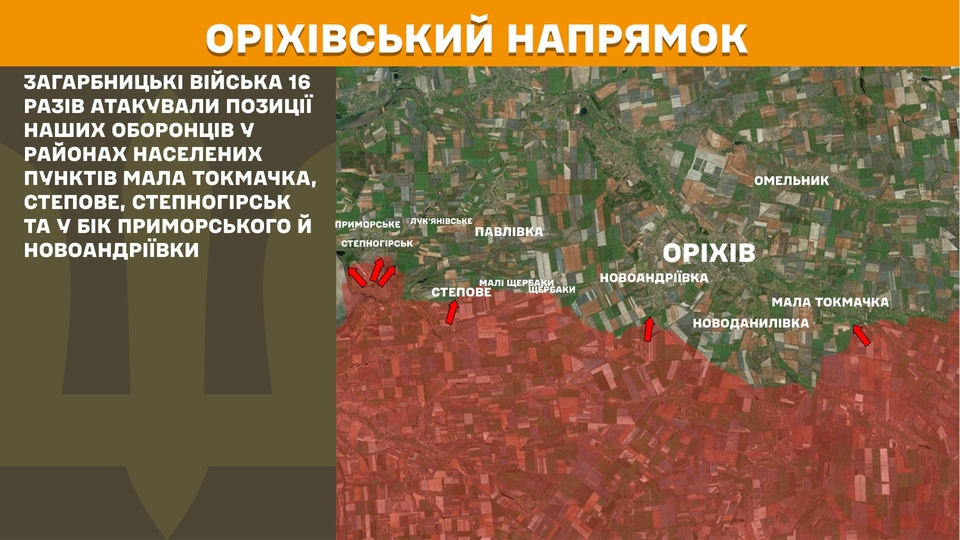 На Оріхівському напрямку загарбницькі війська 16 разів атакували позиції українських оборонців у районах населених пунктів Мала Токмачка, Степове, Степногірськ та у бік Приморського й Новоандріївки.