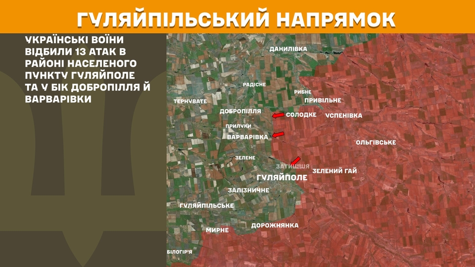На Гуляйпільському напрямку українські воїни відбили 13 атак в районі населеного пункту Гуляйполе та у бік Добропілля й Варварівки.