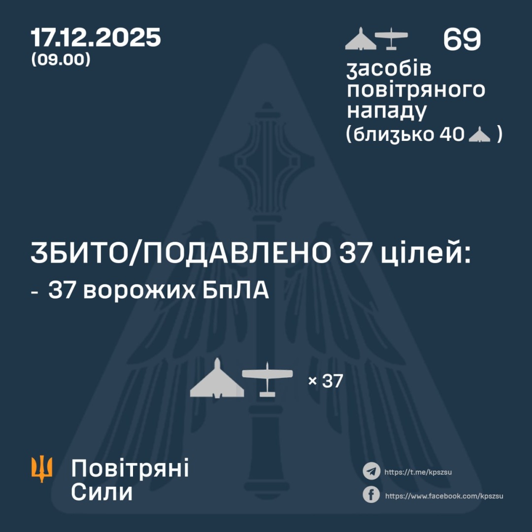 За попередніми даними, станом на 09:00 середи, 17 грудня, ППО збила / подавила 37 ворожих дронів на півночі, півдні та сході України.