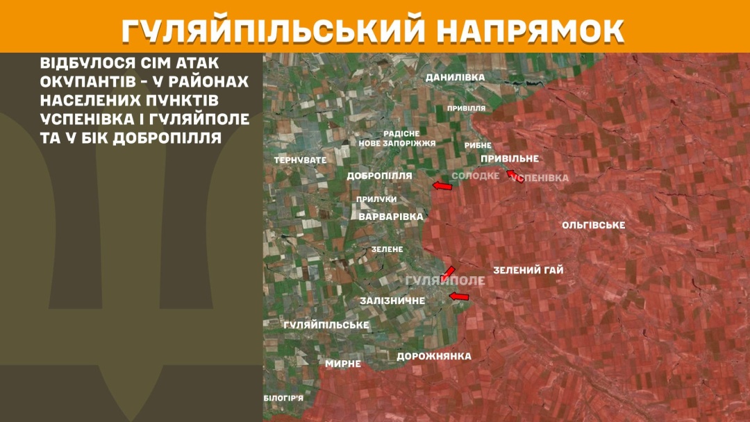 На Гуляйпільському напрямку відбулося сім атак загарбників - у районах населених пунктів Успенівка і Гуляйполе та у бік Добропілля.