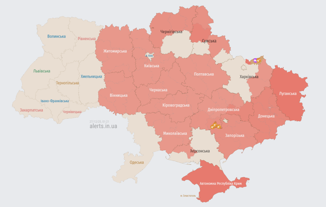 Актуальна мапа повітряних тривог України станом на 01:21 / Джерело: https://alerts.in.ua/
