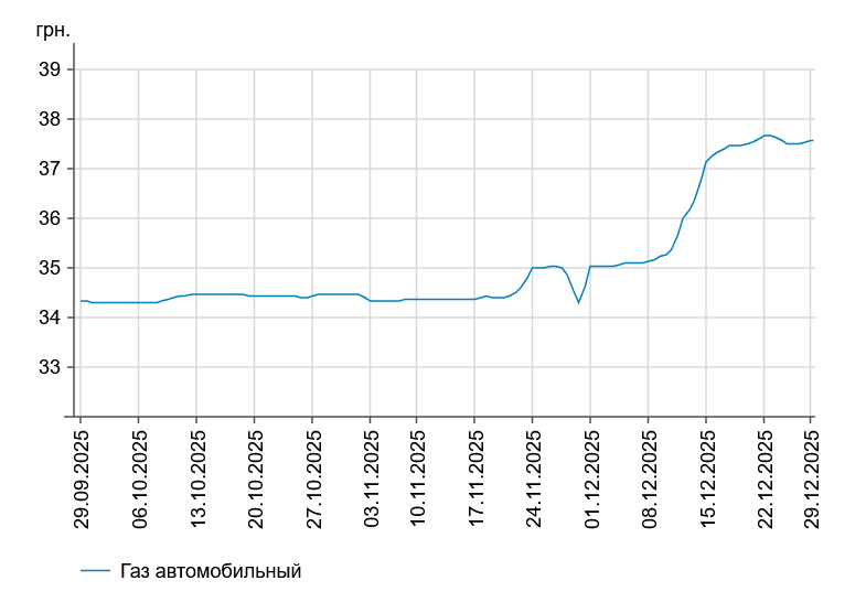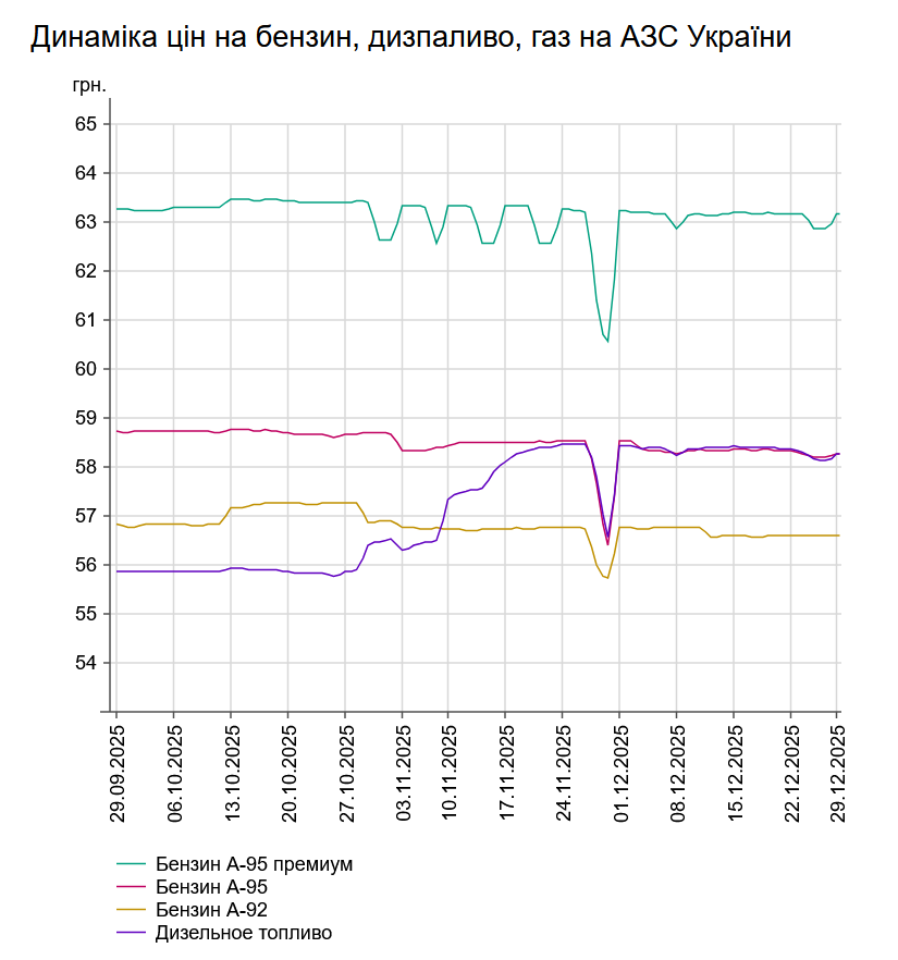 Зокрема, зафіксовано такі середні ціни на пальне: бензин марки А-95 (преміум) - 63,16 грн/л (здорожчав на 29 коп.); бензин марки А-95 - 58,28 грн/л (здорожчав на 8 коп.); бензин марки А-92 - 56,6 грн/л; дизельне пальне - 58,28 грн/л (здорожчало на 16 коп.). Середня ціна автогазу становить 37,58 грн/л, що на 9 коп. більше порівняно із попереднім робочим днем - 26 грудня.