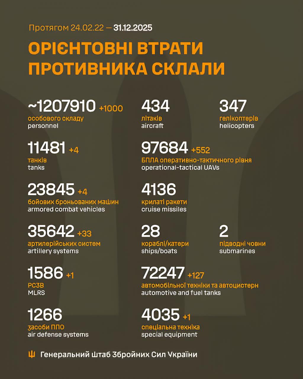 Ми зібрали для вас інформацію про тисяча чотириста сьомий день Великої війни: чим жили Україна та українці 31 грудня 2025 року.