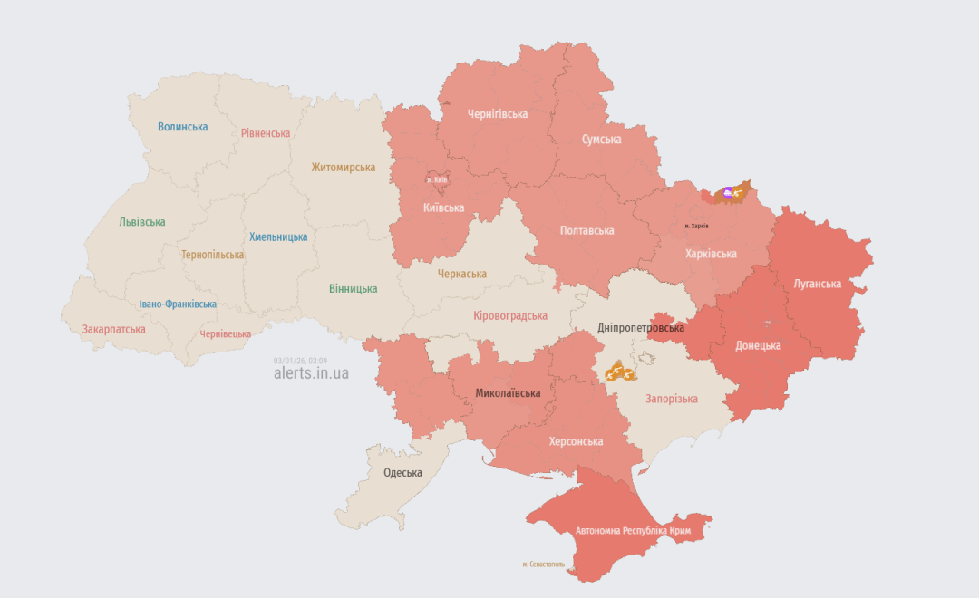 Актуальна мапа повітряних тривог України станом на 03:09 / Джерело: https://alerts.in.ua/