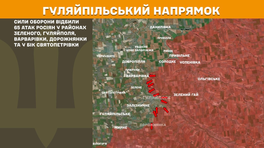 На Гуляйпільському напрямку Сили оборони відбили 65 атак росіян у районах Зеленого, Гуляйполя, Варварівки, Дорожнянки та у бік Святопетрівки.