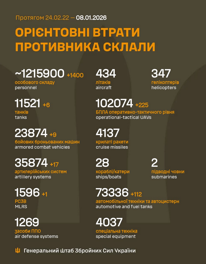 Загальні бойові втрати російських військ з 24 лютого 2022 року по 8 січня 2026 року на війні проти України становлять близько 1 215 900 осіб, зокрема 1 400 осіб - за минулу добу.