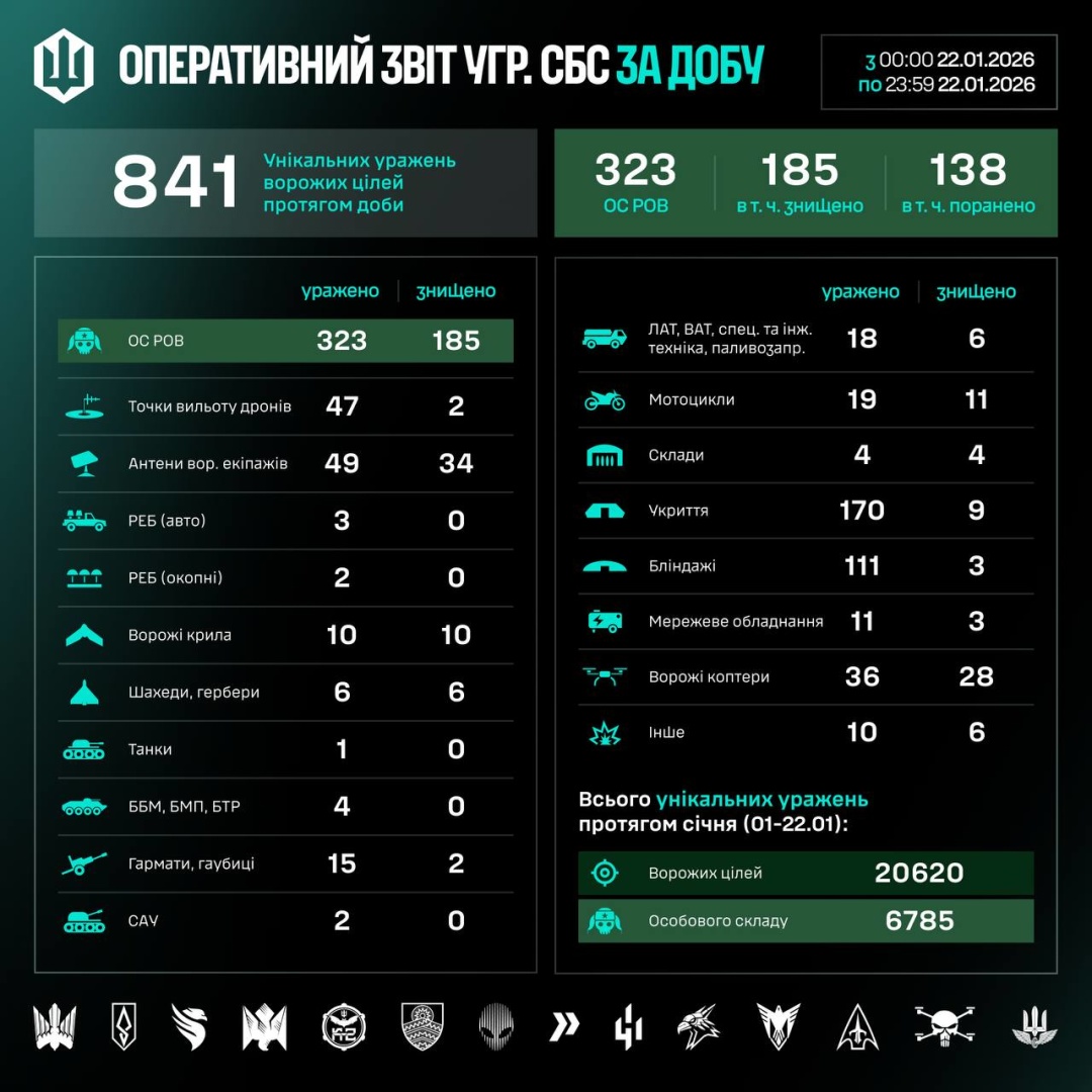 Загалом з 1 по 22 січня підрозжіли СБС знищили та уразили 20620 цілей, з них – 6785 особовий склад росіян.