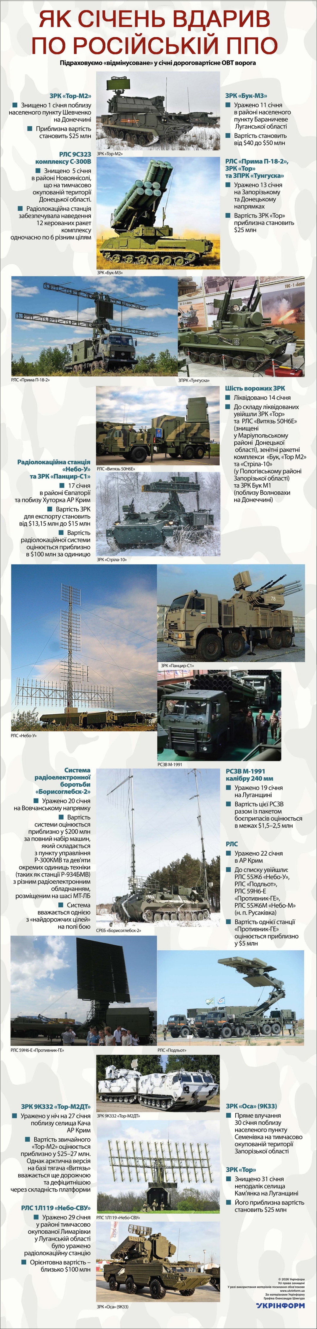 Черговий огляд «жирних» втрат ворожої військової техніки та озброєння охоплює стартовий місяць 2026 року. Особливо невдалим він видався для російської протиповітряної оборони, яка відчутних втрат зазнавала упродовж усього січня, від першого по останній день включно.