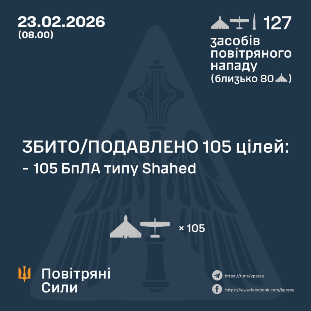 За попередніми даними, станом на 08:00 понеділка, 23 лютого, ППО збила/подавила 105 безпілотників на півночі, півдні та сході України.