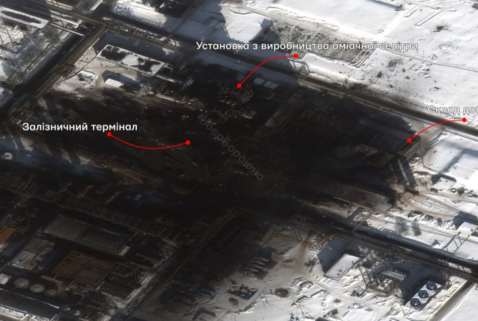 «На кадрах, оприлюднених OSINT-аналітиками «КіберБорошно», видно наслідки ударів дронів FP-1. Основні пошкодження зосереджені в зоні виробництва, зберігання та транспортування аміачної селітри», - ідеться у повідомленні.