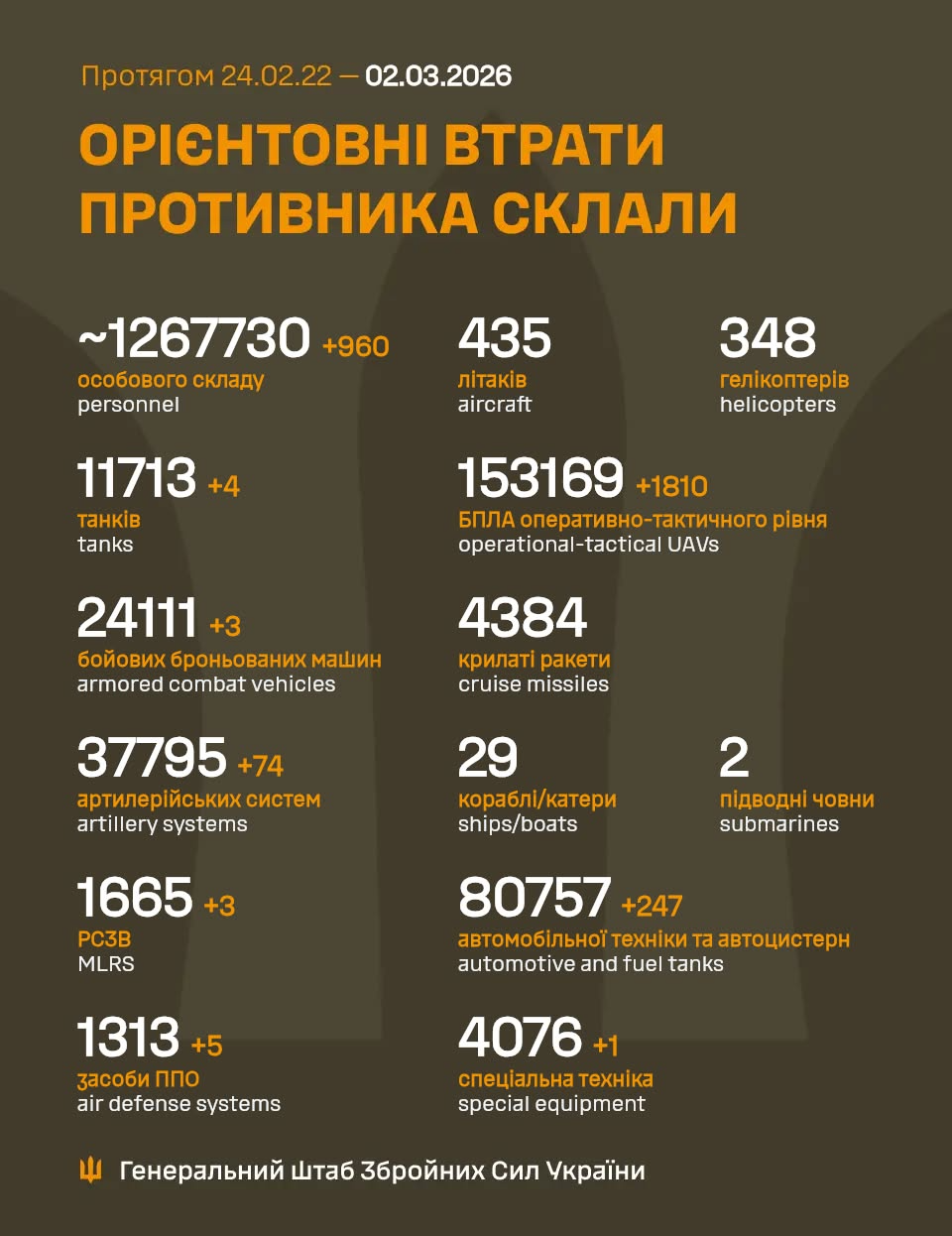Загальні бойові втрати російських військ з 24 лютого 2022 року по 2 березня 2026 року на війні проти України становлять близько 1 267 730 осіб, зокрема 960 осіб - за попередню добу.
