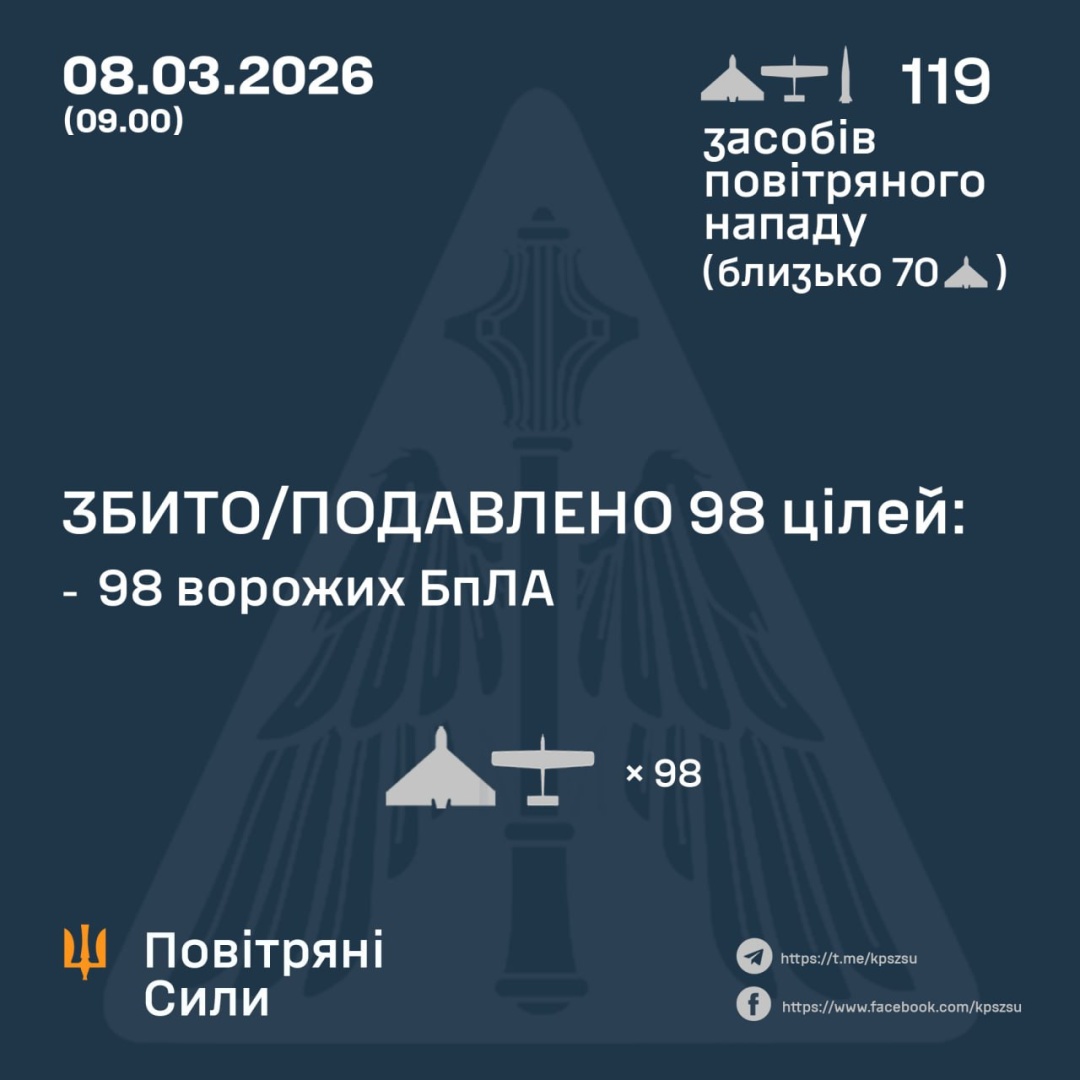 За попередніми даними, станом на 09:00, протиповітряною обороною збито або подавлено 98 ворожих БпЛА типу Shahed, «Гербера» і дронів інших типів на півночі, півдні та сході країни.