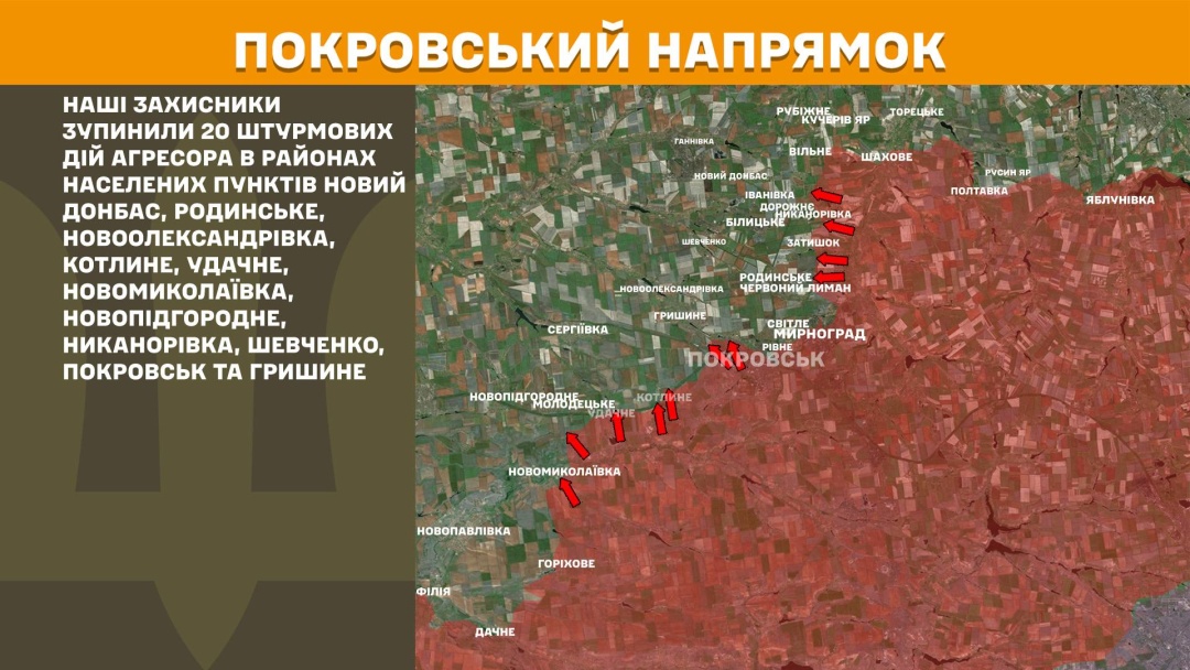 На Покровському напрямку Сили оборони зупинили 29 штурмових дій росіян у районах Червоного Лимана, Никанорівки, Родинського, Мирнограда, Покровська, Гришиного, Молодецького, Котлиного, Удачного, Новомиколаївки та в напрямку Вільного і Новоолександрівки.