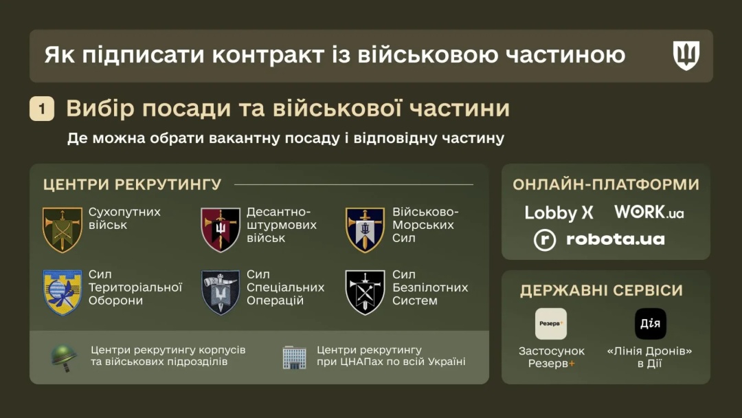 Шлях до контрактної служби варто починати з пошуку вакансії та конкретної військової частини. Це можна зробити через: