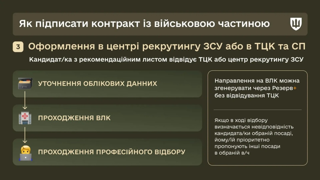 "Після обрання посади починається комунікація (самостійно чи з допомогою рекрутера) з відповідною військовою частиною. Як правило, вона включає етапи співбесіди, перевірки фізичної готовності і психолого-діагностичного тестування", - зазначили у міністерстві.