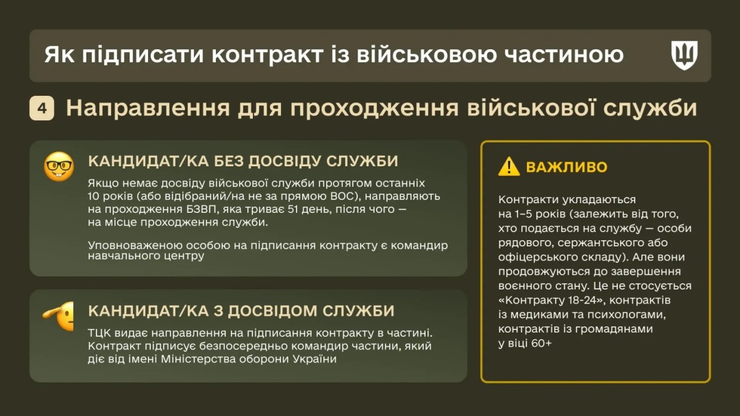 "Варто мати на увазі, якщо кандидат не має досвіду військової служби протягом останніх 10 років (або відібраний не за прямою ВОС), його направляють на проходження базової загальної військової підготовки, яка триває 51 день, після чого – на місце проходження служби. Таким чином, уповноваженою особою на підписання контракту є командир навчального центру", - пояснили у Міноборони..