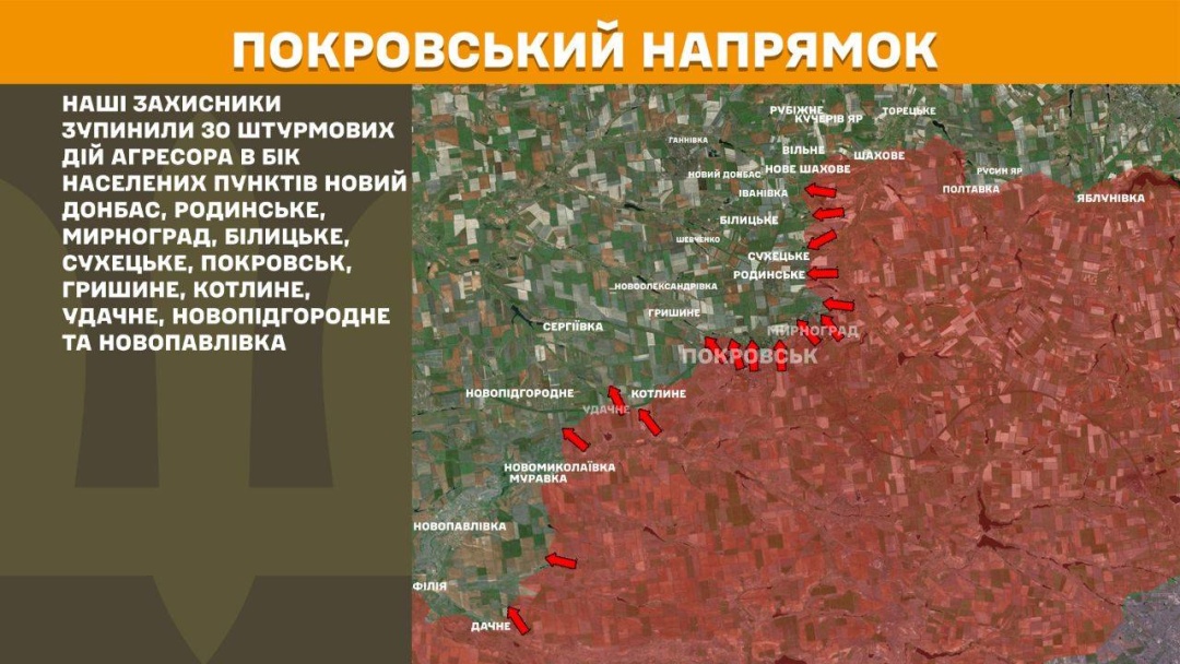 На Покровському напрямку наші захисники зупинили 30 штурмових дій агресора в бік населених пунктів Новий Донбас, Родинське, Мирноград, Білицьке, Сухецьке, Покровськ, Гришине, Котлине, Удачне, Новопідгородне та Новопавлівка.
