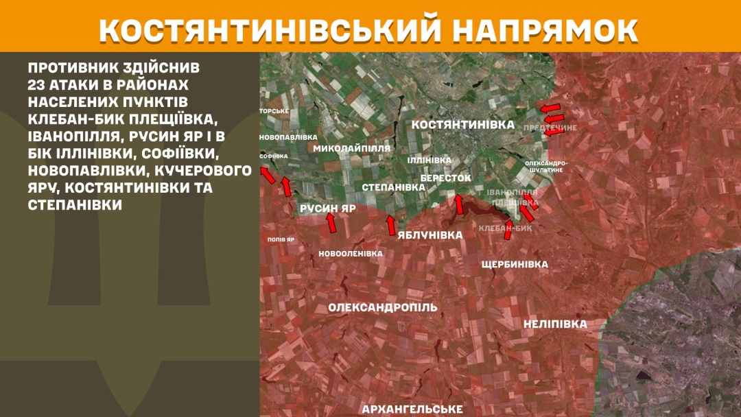 На Костянтинівському напрямку російська армія здійснила 23 атаки у районах Клебан-Бика, Плещіївки, Іванопілля, Русиного Яру та в бік Іллінівки, Софіївки, Новопавлівки, Кучерового Яру, Костянтинівки і Степанівки.